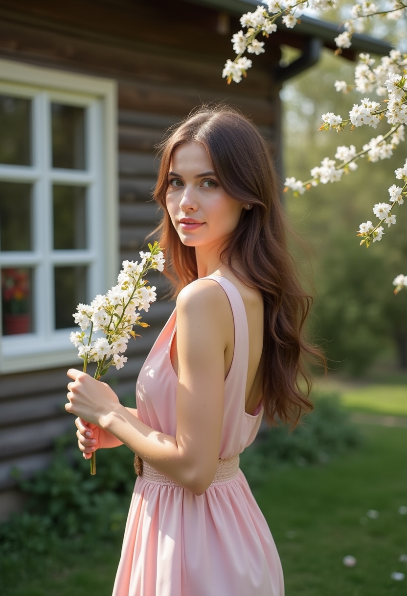 Женщина в светло-розовом сарафане с тонким поясом позирует на фоне цветущего сада. Она держит в руках ветку с белыми цветами и смотрит через плечо в камеру. Позади виден деревянный дом с открытыми окнами. Освещение мягкое, акцент на её утончённости и весеннем настроении.