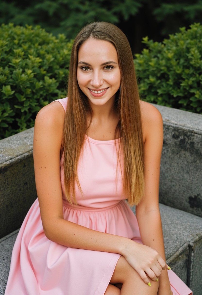 Женщина в светло-розовом сарафане сидит на каменной скамье в дендрарии, окружённая пышными цветущими кустами. Она смотрит прямо в камеру с нежным выражением лица, её руки аккуратно сложены на коленях. Позади густая растительность, создающая ощущение уединённости и летней атмосферы. Крупный план, подчёркивающий мягкость образа.