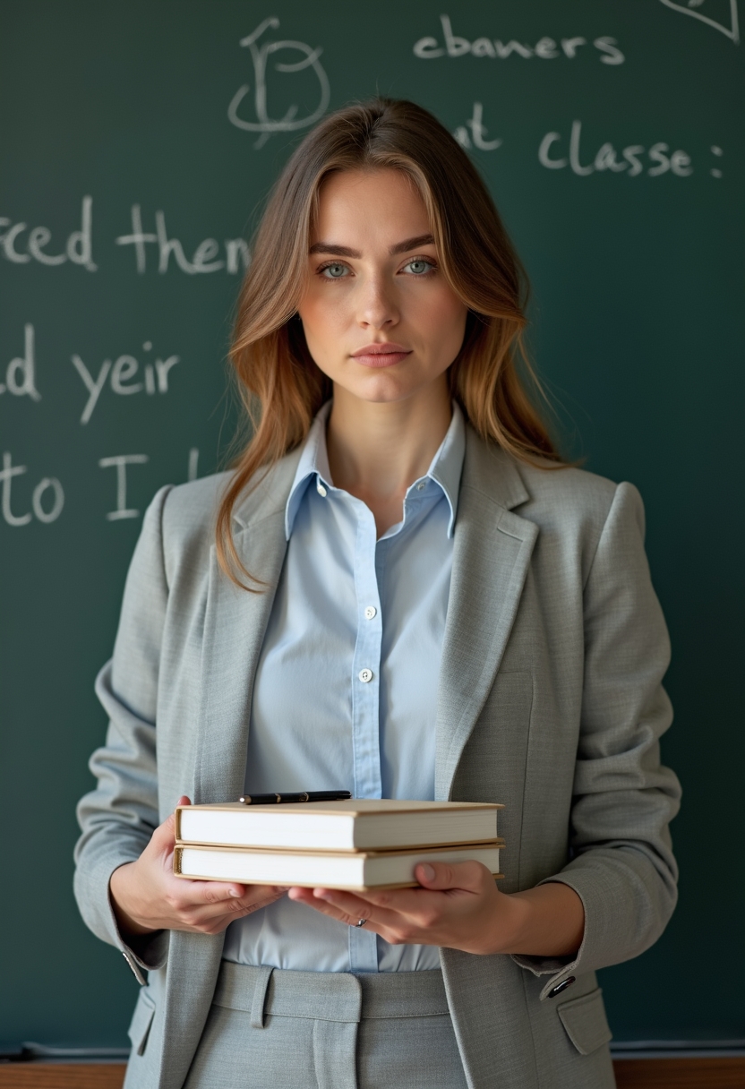Женщина в светло-сером брючном костюме стоит у классной доски, держа в руках стопку тетрадей. Она смотрит в камеру с серьёзным и собранным выражением. Крупный план, подчёркивающий её организованность и строгость.
