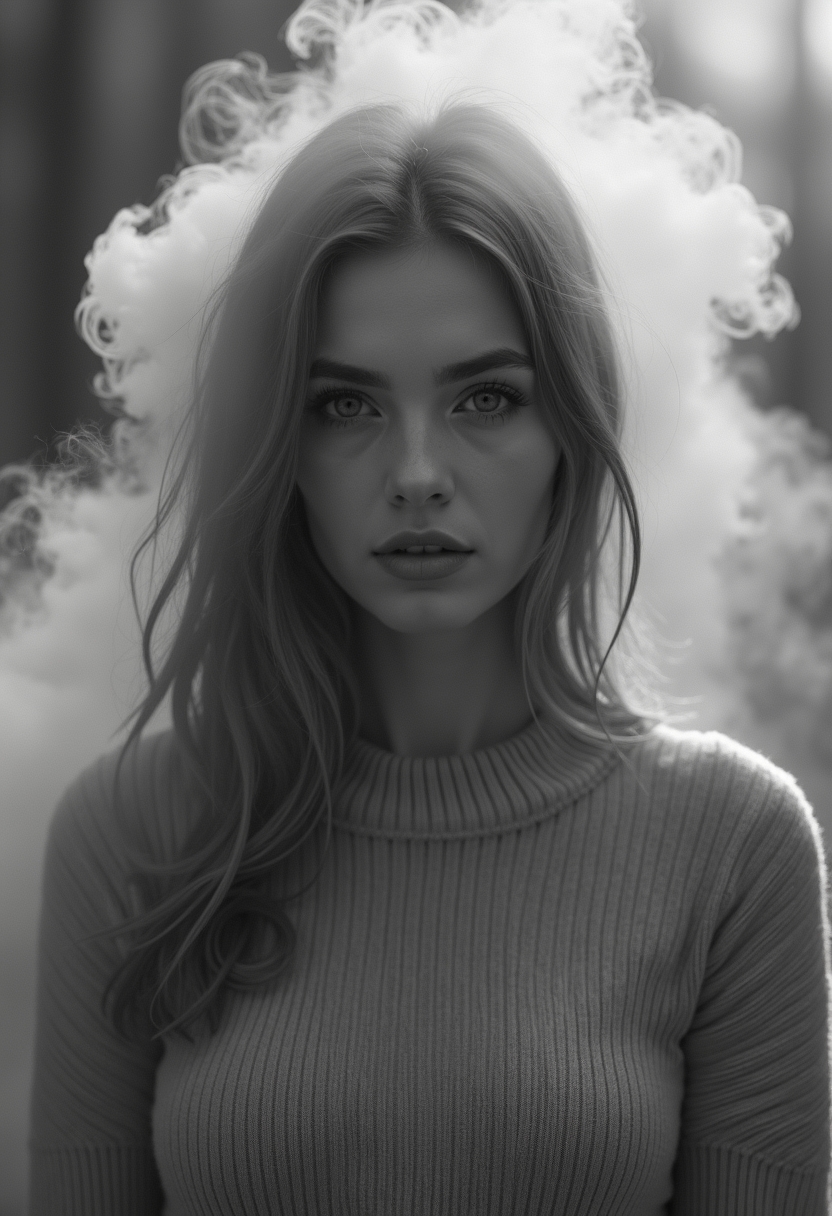 Женщина в светло-сером свитере стоит среди клубов плотного серого дыма. Её лицо крупным планом, взгляд направлен прямо в камеру. Дым подчёркивает её силуэт, создавая загадочную атмосферу. Освещение естественное, чёрно-белая гамма.