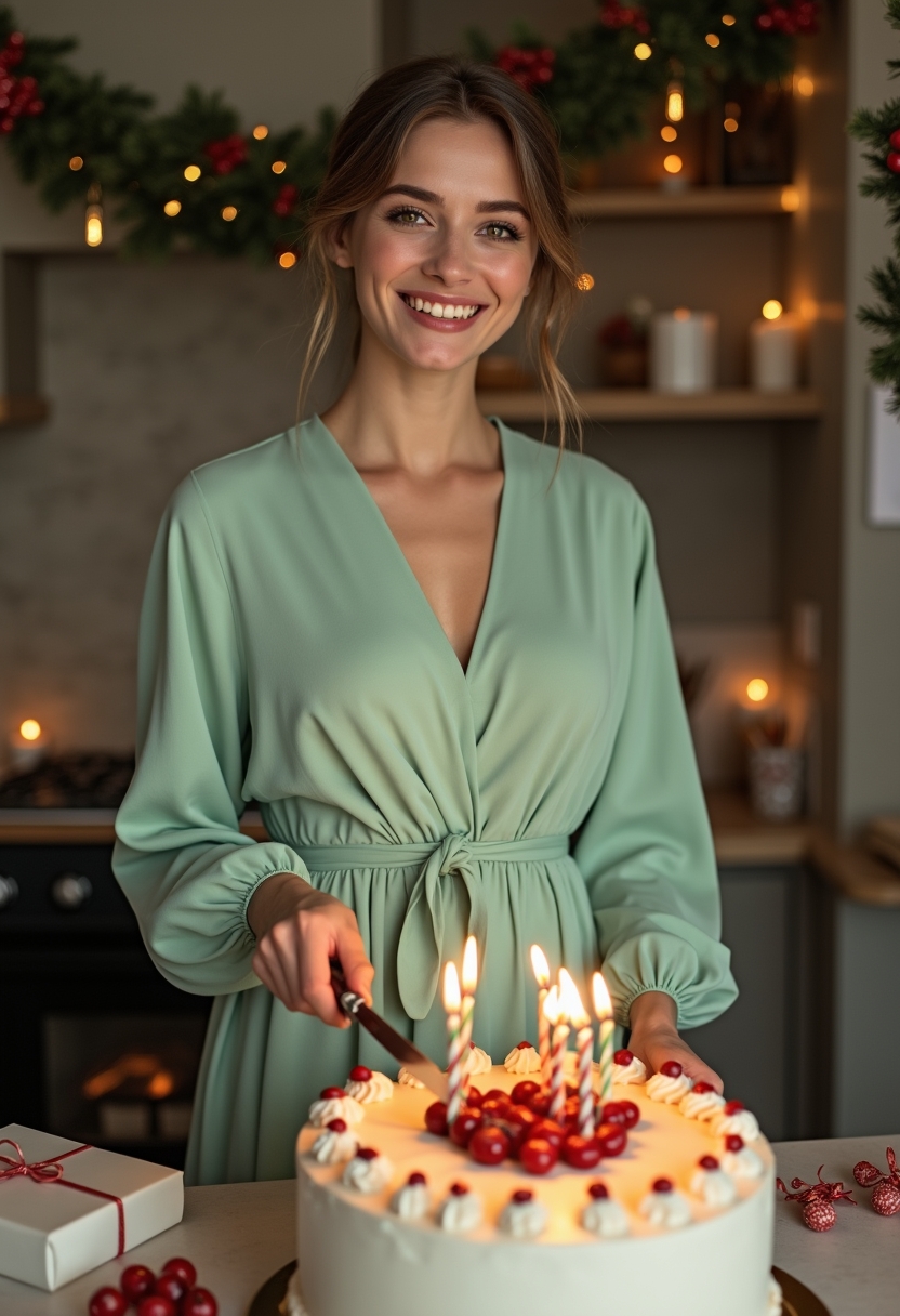 Женщина в светло-зелёном платье с длинными рукавами стоит возле огромного торта, украшенного свечами и ягодами. Она держит нож для разрезания торта и смотрит прямо в камеру. Позади видны гирлянды и подарки. Освещение мягкое, акцент на её улыбке и яркости торта.