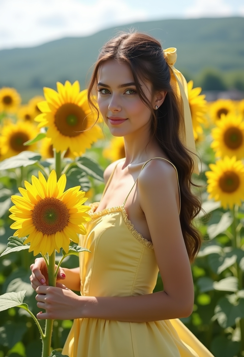 Женщина в светло-жёлтом сарафане с лентой в волосах стоит на фоне поля с подсолнухами. Её взгляд направлен прямо в камеру, а руки держат большой подсолнух. Позади виднеются зелёные холмы. Освещение естественное, акцент на яркости и весеннем пейзаже.