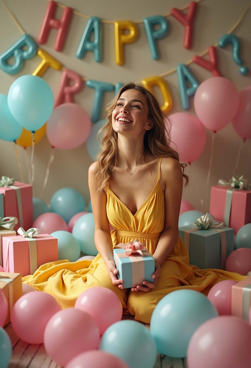 Женщина в светло-жёлтом сарафане сидит на полу среди множества разноцветных подарков и шариков. Она держит в руках подарочную коробку с бантом и смотрит вверх с восторгом. Позади виден баннер с надписью 'Happy Birthday'. Освещение мягкое, акцент на её эмоциях.