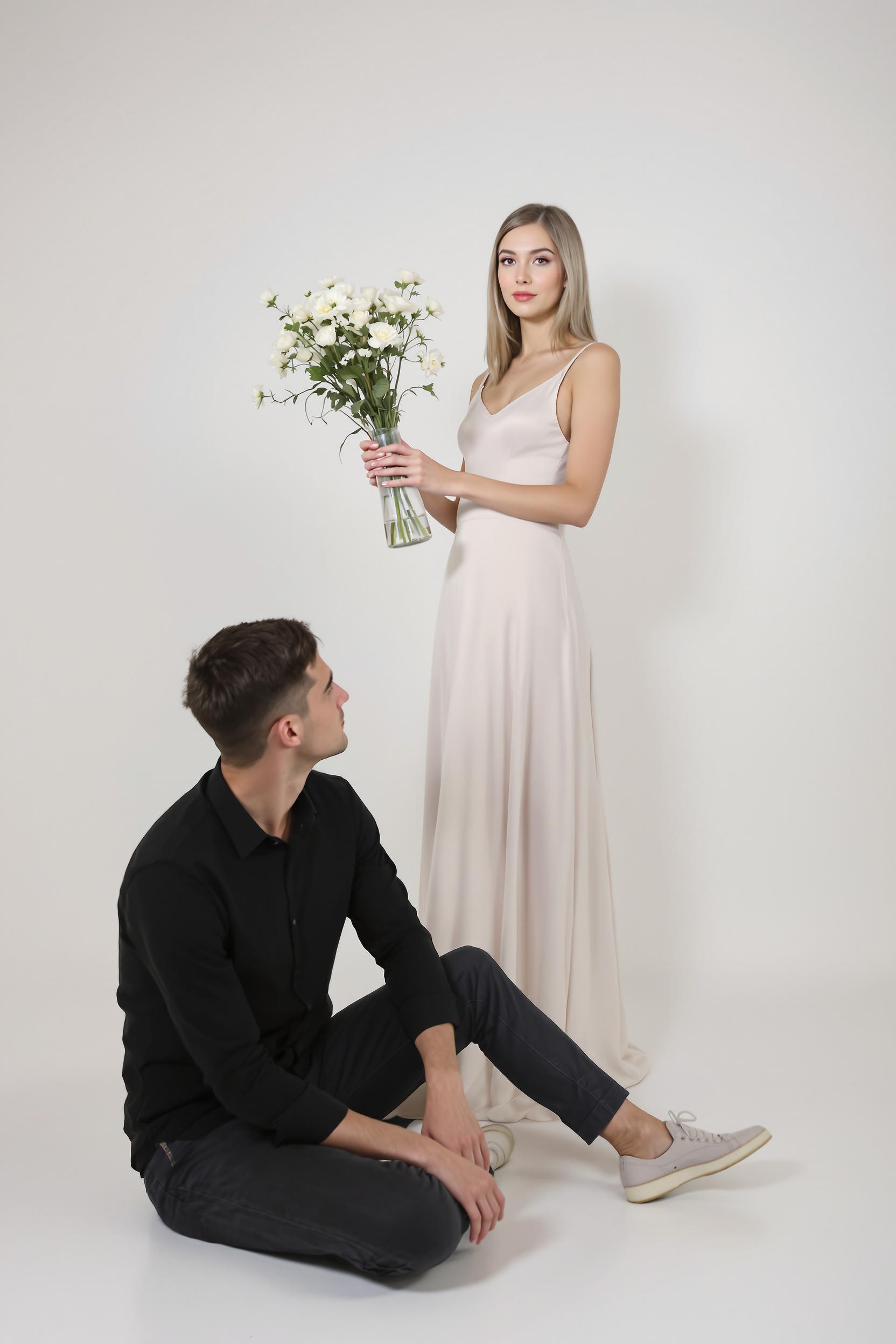 Женщина в светлом лаконичном платье стоит на циклораме, одной рукой держит вазу с белыми цветами, парень сидит на полу у её ног, смотря в сторону. Она с прямым гордым взглядом смотрит в камеру, акцент на её позе, минимализм пространства.
