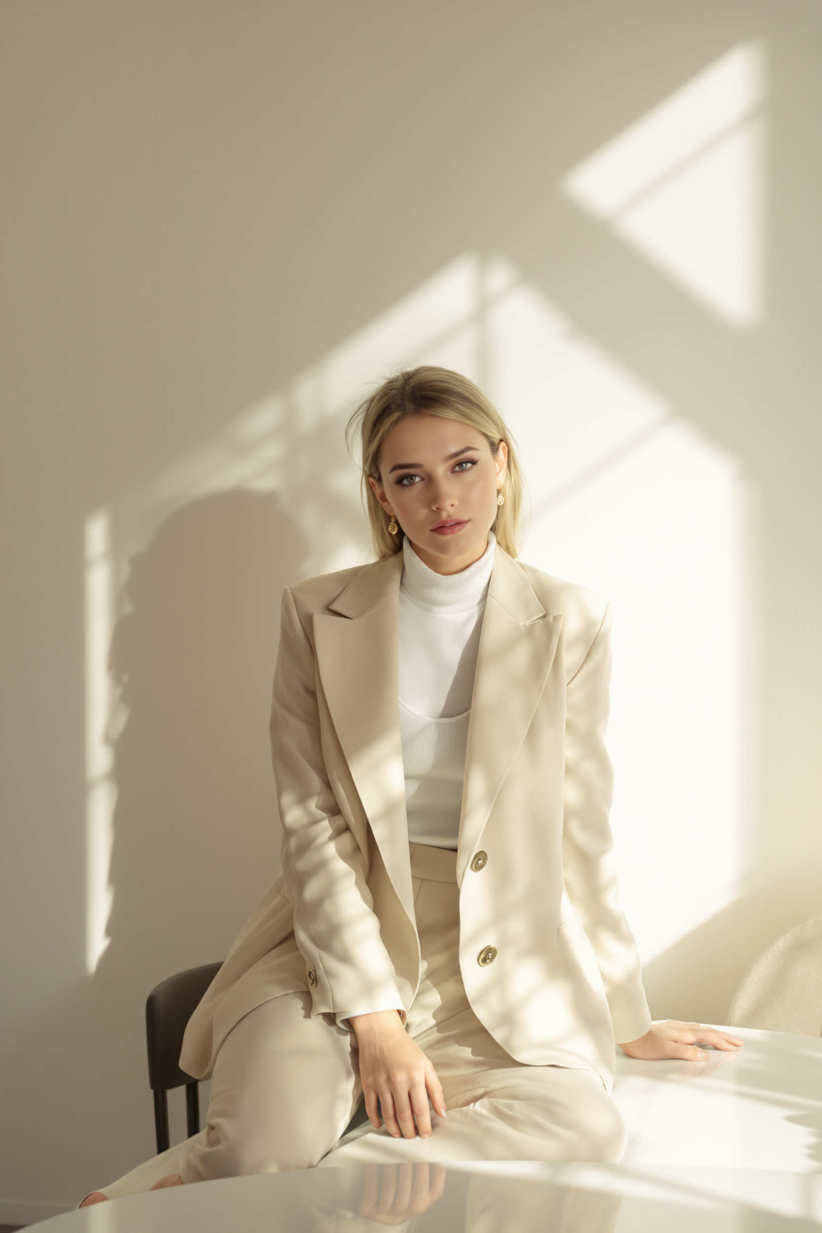 Женщина в светлом пиджаке и белой майке с высоким горлом сидит на краю студийного стола, положив одну ногу на стул и оперевшись рукой на колено. Мягкое естественное освещение, солнечные блики на стене, минимализм, спокойный макияж.
