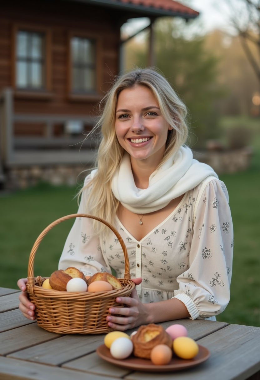 Женщина в светлом платье с цветочным узором и белом платке сидит за деревянным столом на улице, её руки держат корзину с пасхальными яйцами и свежевыпеченным куличом. Она улыбается, глядя в камеру, а позади деревянная изба и цветущие деревья. Крупный план, подчёркивающий тёплую атмосферу деревенского праздника.