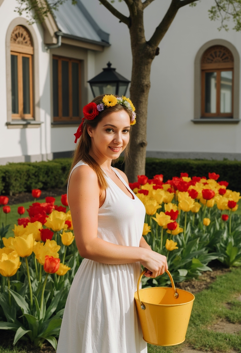 Женщина в светлом сарафане с красным поясом и кокошником из полевых цветов на голове стоит на фоне цветущего сада, полного яблоневых деревьев и ярких тюльпанов. В руках она держит ковш с водой и смотрит на зрителя с доброй улыбкой. На заднем плане виден красивый дом с резными наличниками. Освещение солнечное, акцент на её лице и наряде.