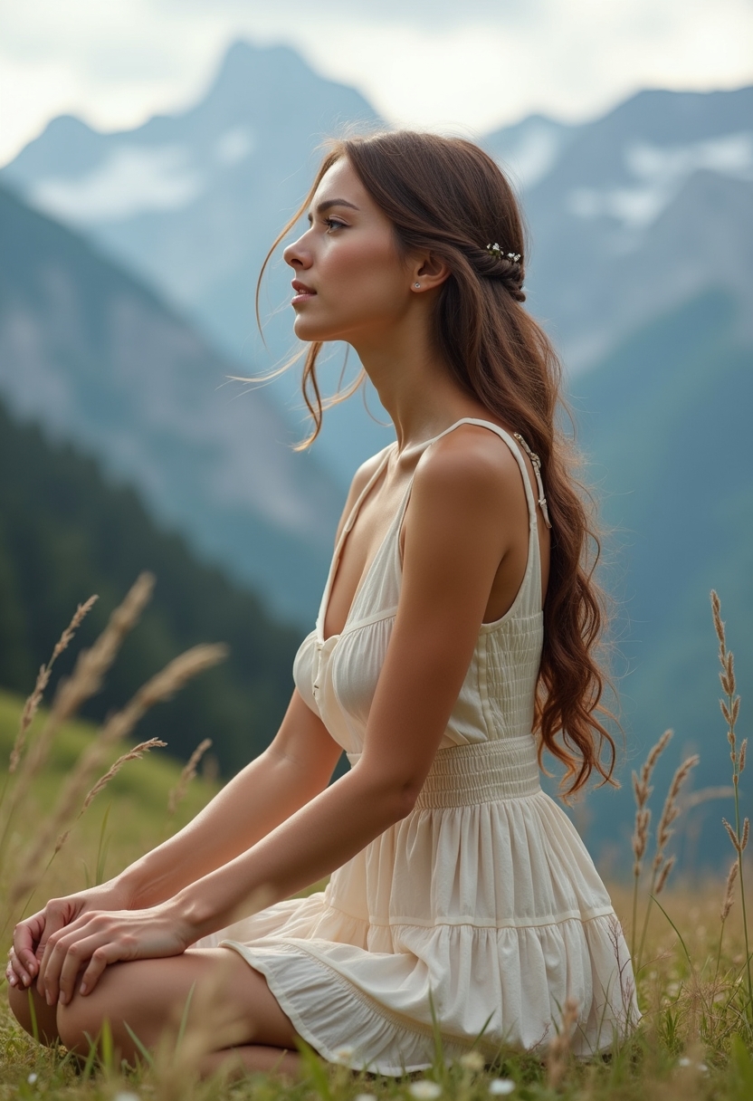 Женщина в светлом сарафане сидит на горной поляне, её пальцы перебирают стебли трав. Она задумчиво смотрит в сторону, а ветер нежно треплет её волосы. Позади величественные горные вершины. Крупный план, акцент на гармонии с природой и умиротворённости.