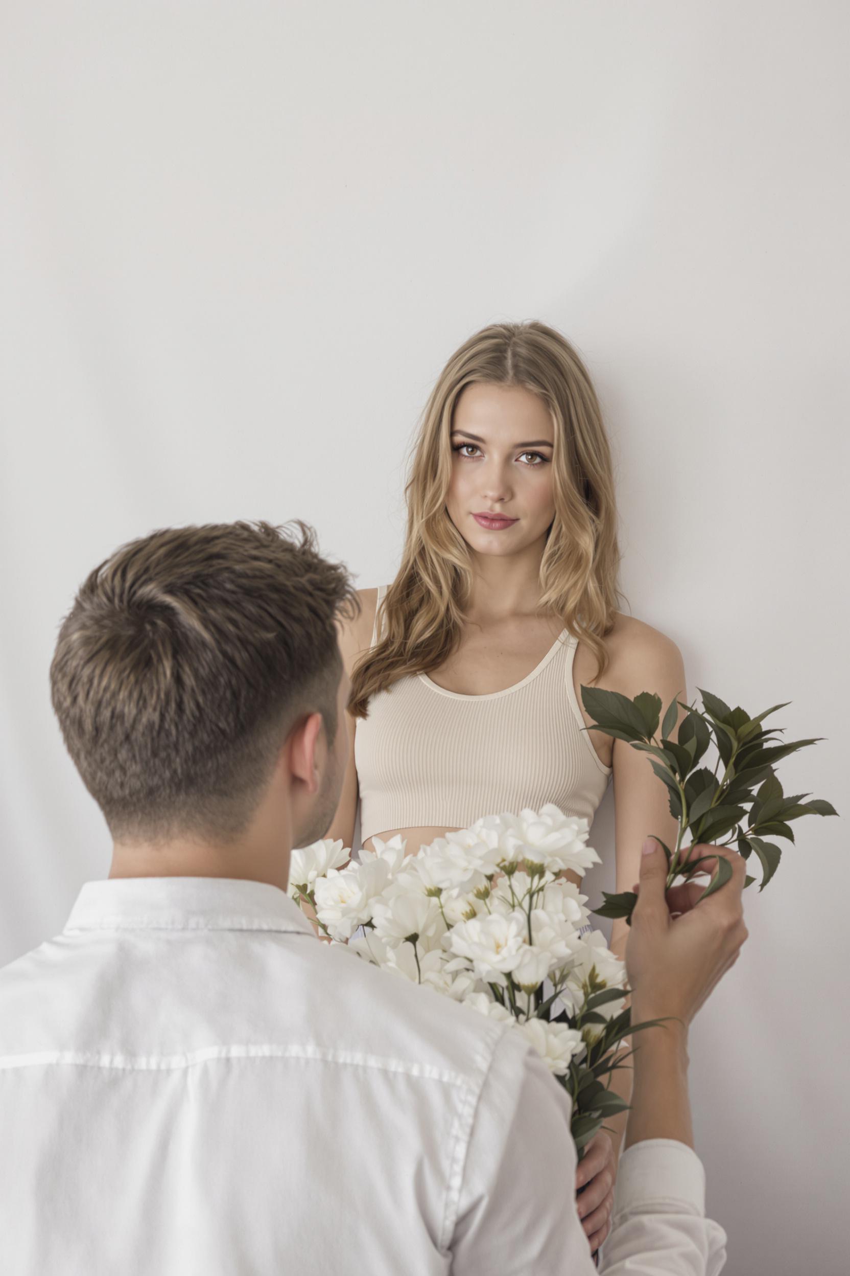 Женщина в светлом топе стоит у белой стены циклорамы, смотрит прямо в камеру с уверенным выражением. Рядом сидит парень спиной, он подаёт ей лаконичный букет белых цветов. Минималистичный интерьер подчёркивает её женственность.