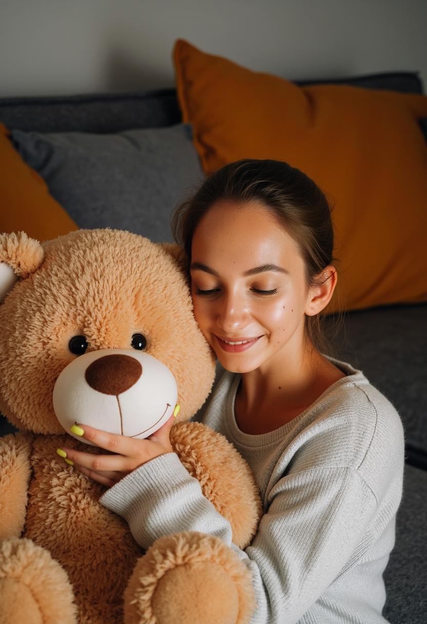 Женщина в светлом вязаном свитере держит большого плюшевого медведя перед собой, его голова чуть выше её плеч. Она прижимается щекой к мягкому меху, её глаза закрыты, выражение лица спокойное. Позади диван с пушистым пледом, приглушённый тёплый свет подчёркивает расслабленность момента.