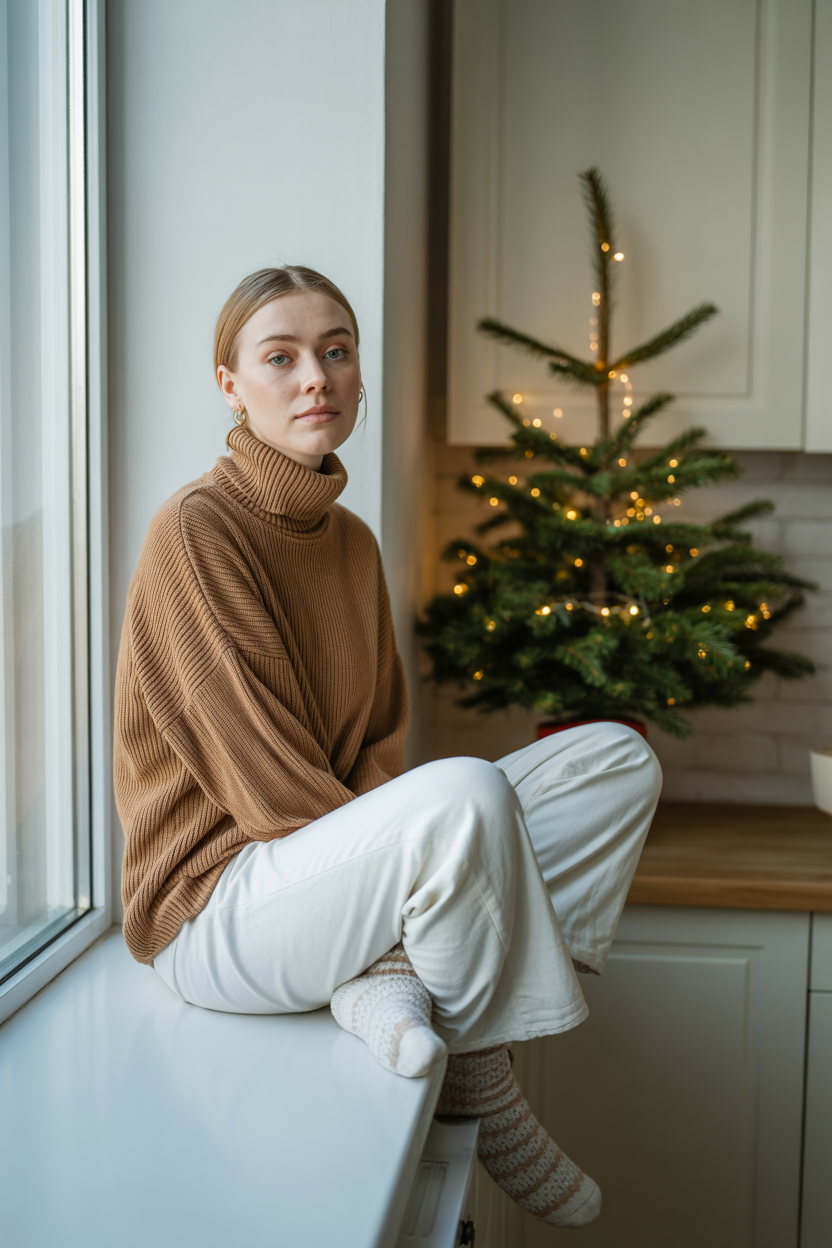 Женщина в светлой минималистичной кухне рядом с компактной элегантной ёлкой, одета в тонкий карамельный трикотажный джемпер с высоким воротом и свободные белые брюки, на ногах уютные носки. Она сидит боком на широком подоконнике, подсвеченном гирляндой, смотрит прямо в камеру, вокруг нежное дневное освещение.