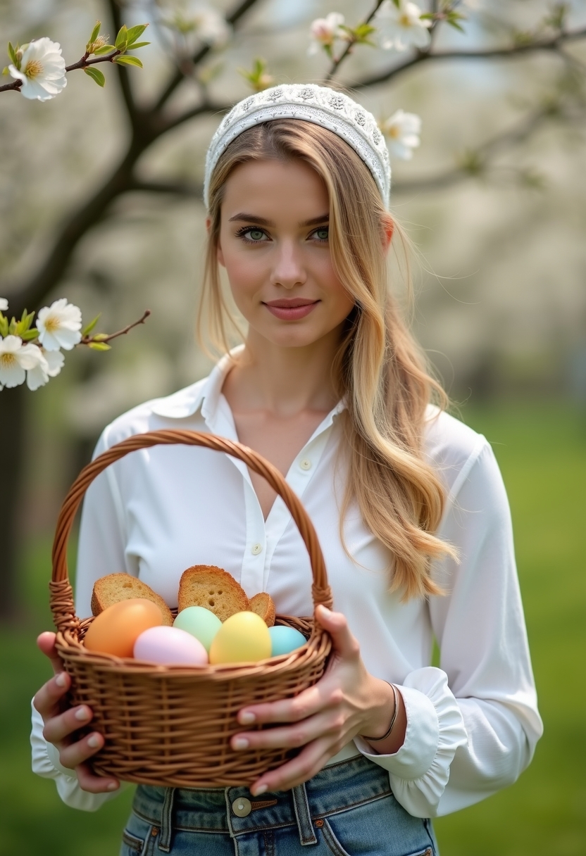 Женщина в светлой одежде и косынке стоит в цветущем саду, её руки держат корзинку с куличом и крашеными яйцами. Она смотрит прямо в камеру, её лицо освещает утренний солнечный свет. Позади яблоневые деревья в белоснежном цвету. Крупный план, подчёркивающий весеннее пробуждение и чистоту праздника.