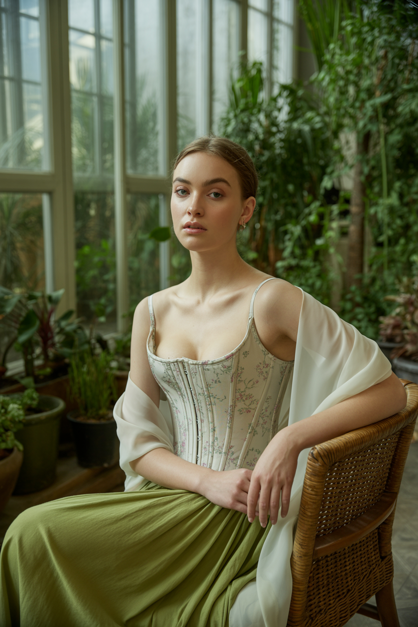 Женщина в светлой оранжерее среди зелёных растений, одета в светлый корсет с цветочным узором, длинную зелёную юбку и легкую накидку. Она сидит на плетёном кресле, положив локоть на ручку, уверенно смотрит в камеру, на фоне высокие стеклянные окна и пышная листва.