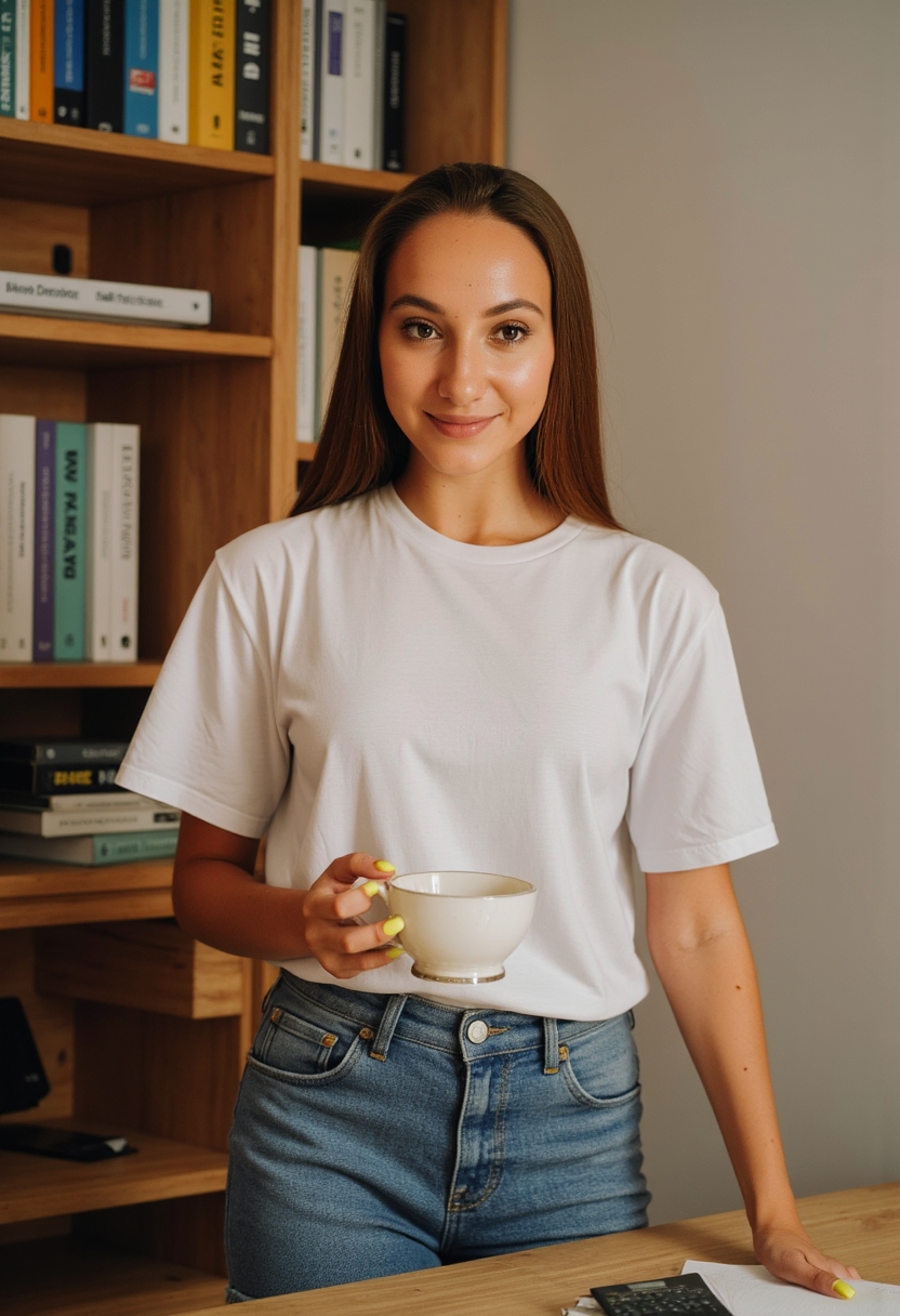 Женщина в светлой рубашке и джинсах стоит у деревянного стола, держит чашку кофе, позади высокий книжный стеллаж, она смотрит прямо в камеру