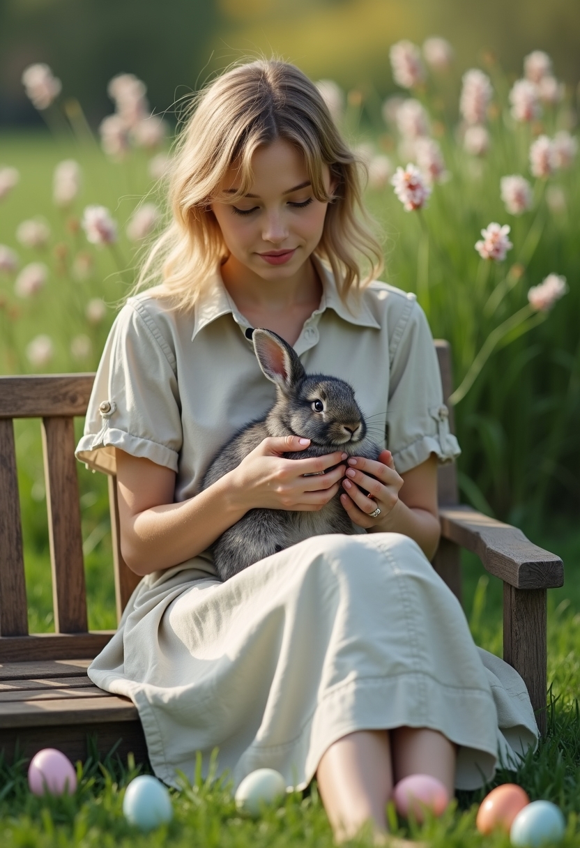 Женщина в светлой юбке и рубашке сидит на деревянной скамейке, держа в руках маленького серого кролика. Она нежно прижимает его к себе, а вокруг разбросаны крашеные яйца в траве. Позади зелёный луг и цветущие кусты. Крупный план, передающий весеннее настроение.