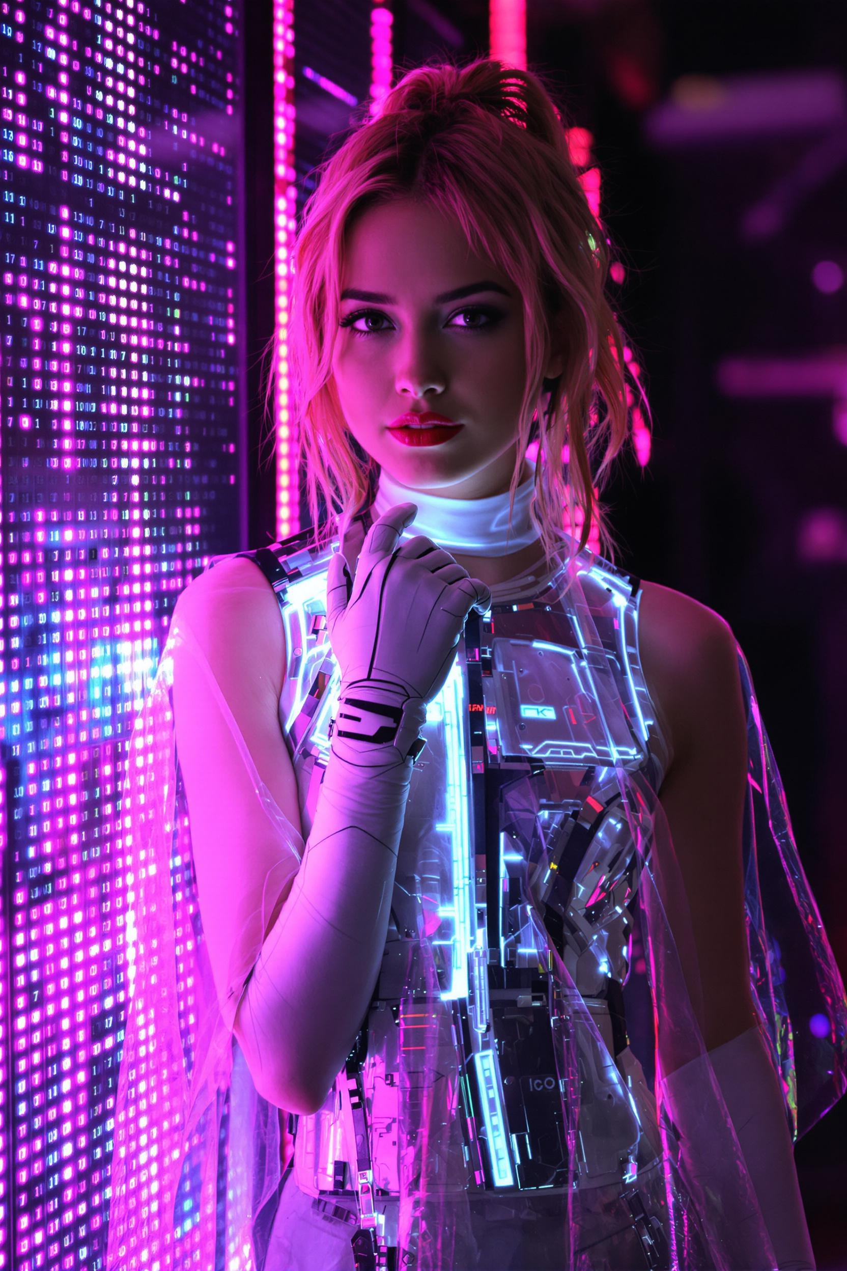 Женщина в асимметричном неоново-розовом плаще с интегрированной подсветкой, под плащом короткий топ с голографическим узором и высокие металлические брюки. На фоне урбанистических конструкций и пульсирующей неоновой графики, средний план, прямой взгляд в камеру.