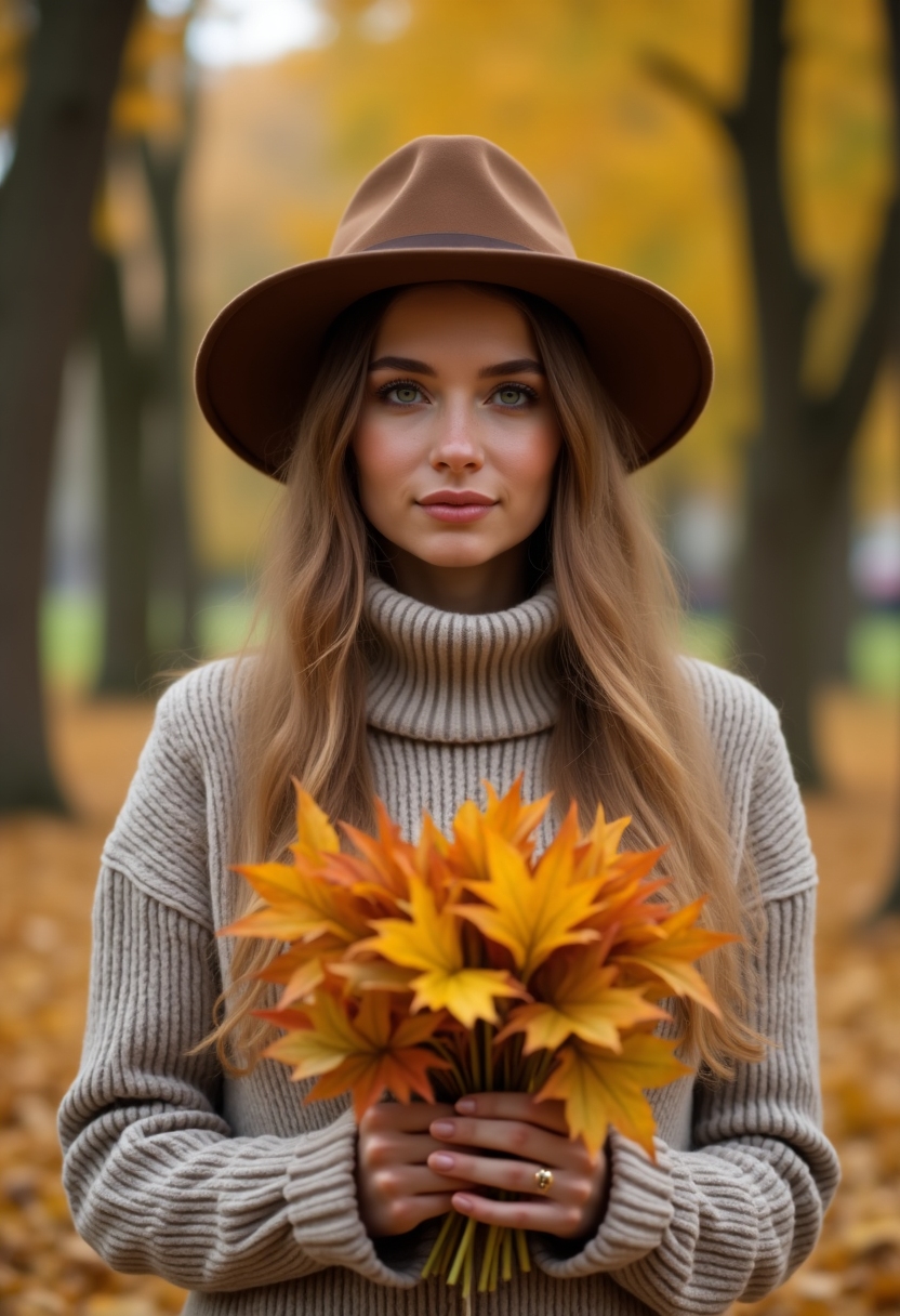 Женщина в свитере и шляпе держит букет осенних листьев на фоне парка