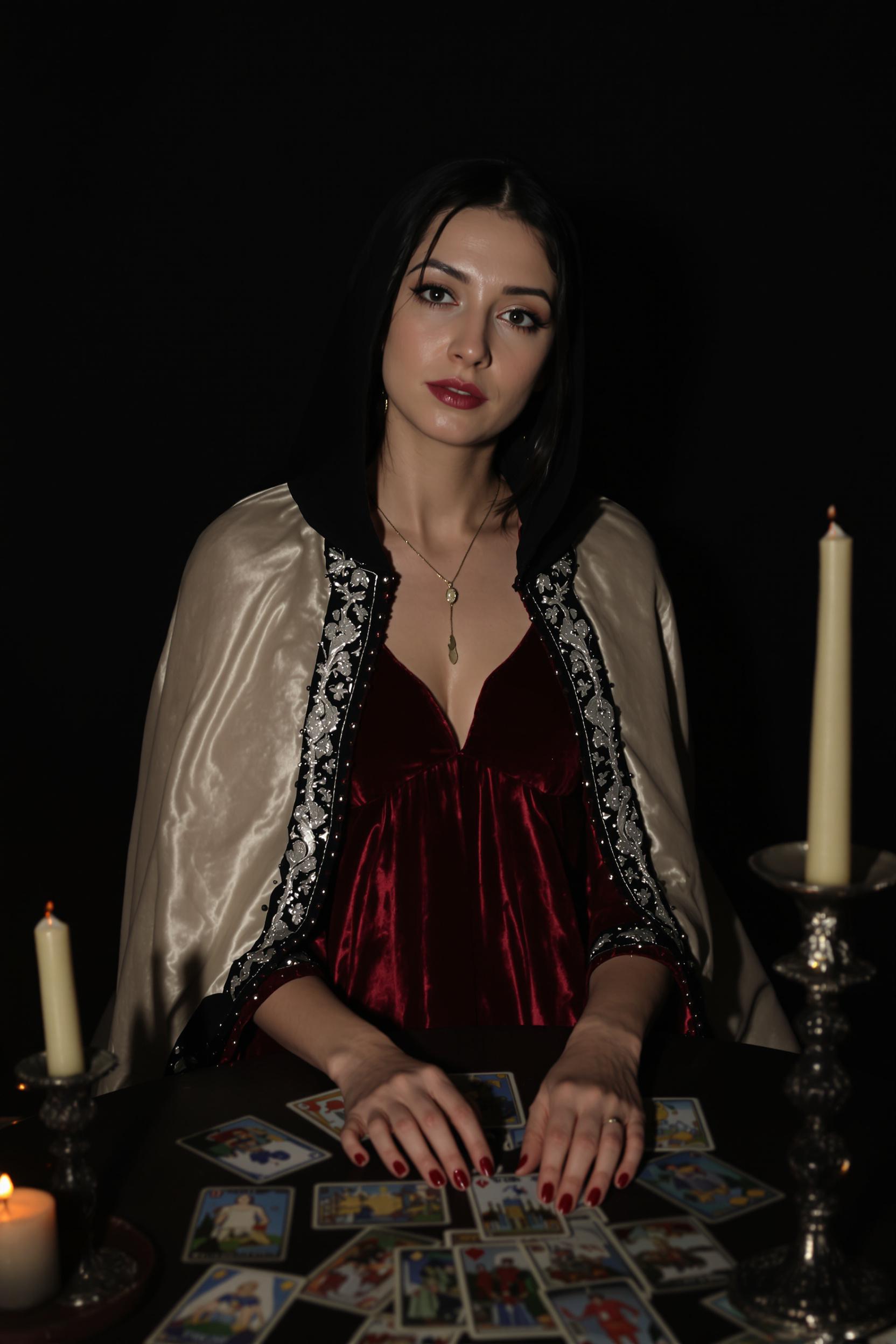 Женщина в свободном длинном платье насыщенного бордового цвета с бархатной отделкой, на плечах легкая черная накидка с серебряной вышивкой. Она сидит за круглым столом, перед ней веером разложены карты Таро, свечи по бокам. Смотрит прямо в камеру, полумрак.