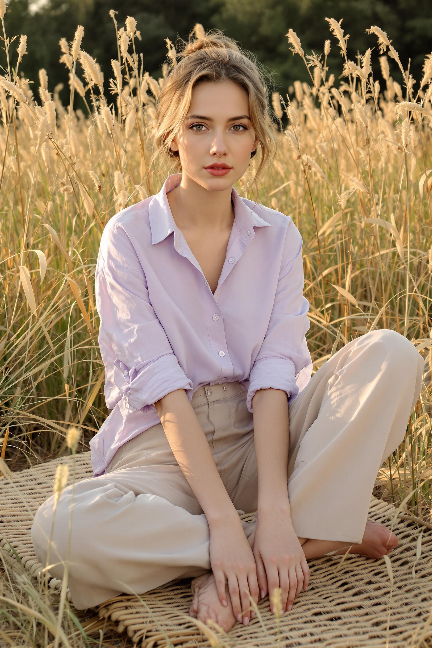 Женщина в свободной хлопковой рубашке цвета нежной лаванды и светло-бежевых брюках сидит на плетёном коврике среди полевых трав, руки лежат на коленях, смотрит прямо в камеру, вокруг золотой закат и аромат пионов, атмосфера спокойствия.