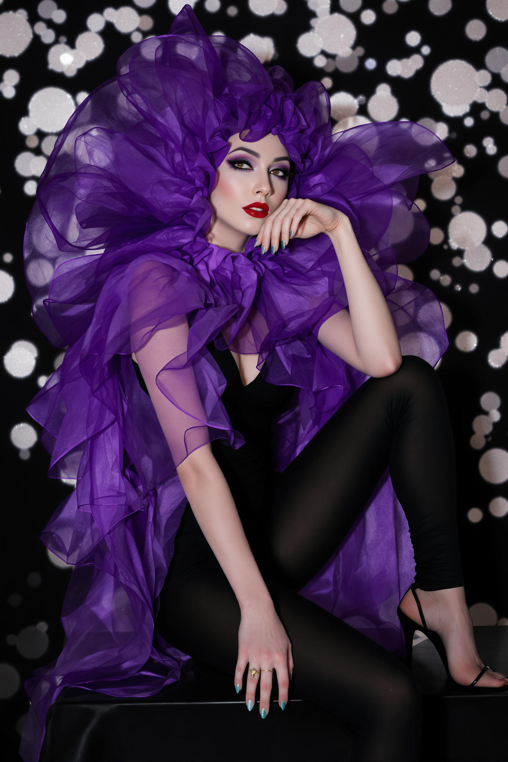 Женщина в театральном костюме с объемистой фиолетовой накидкой из полупрозрачного шифона, под ней структурированный черный комбинезон. Сидит на столе, одна нога согнута, рукой опирается о стол, вторая рука образует острый угол перед лицом, смотрит прямо в камеру. Фон — абстрактные световые пятна.
