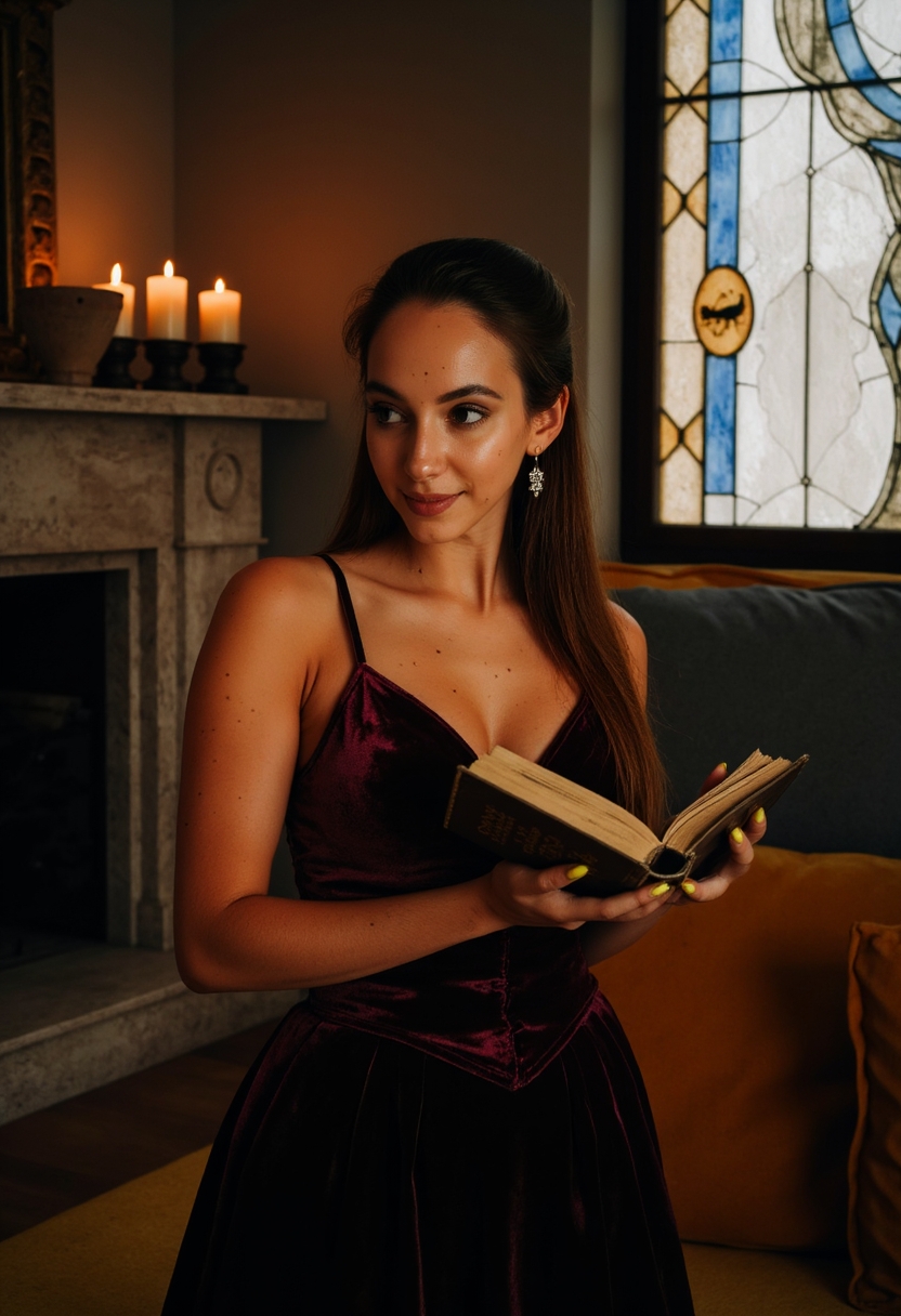 Женщина в тёмно-бордовом платье с бархатным корсетом и серебряными серьгами в форме крестов позирует у огромного окна с витражами. В руках она держит старинную книгу с золотым тиснением. Позади виден массивный камин с горящими свечами. Освещение тёплое, акцент на её украшениях и атмосфере загадочности.