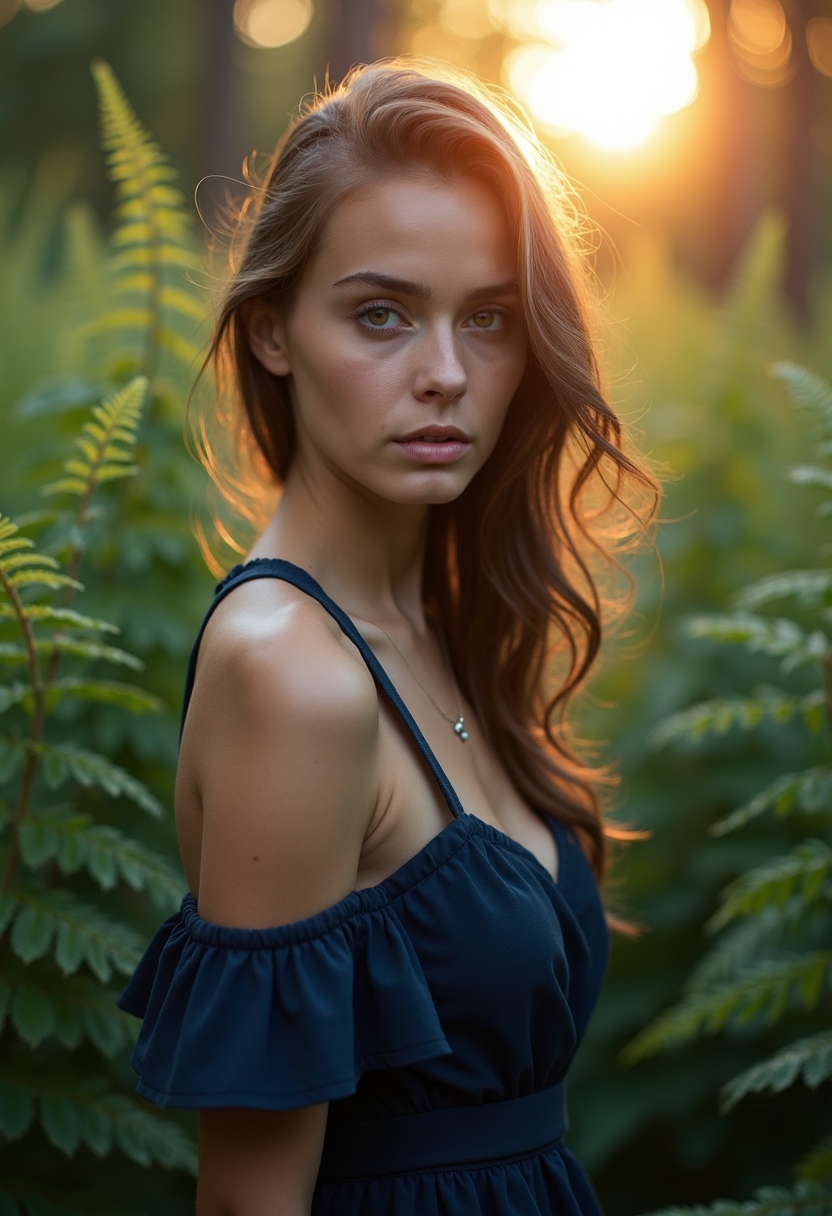 Женщина в тёмно-голубом платье с оголёнными плечами стоит среди высоких папоротников в дендрарии, её волосы слегка развеваются на ветру. Она пристально смотрит в камеру, а солнечные лучи пробиваются сквозь крону деревьев, освещая её лицо мягким светом. Крупный план, создающий эффект загадочности и естественной красоты.