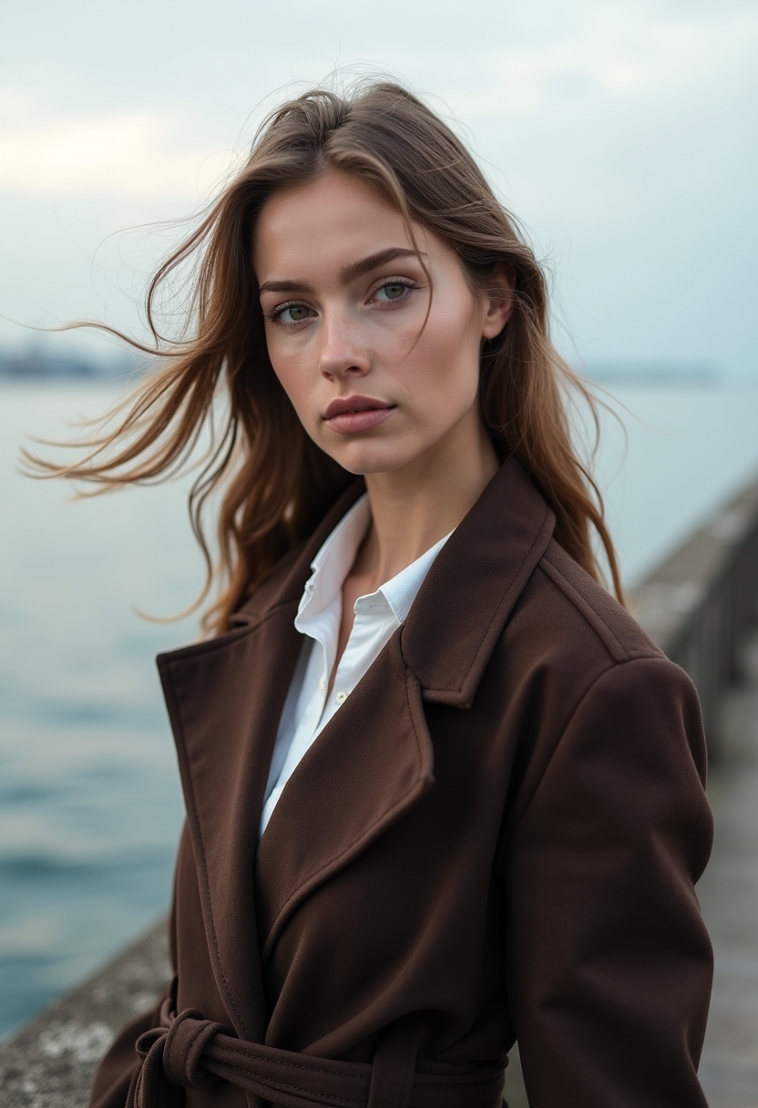 Женщина в тёмно-коричневом двубортном жакете с широким поясом и белой рубашке стоит на причале с видом на морскую гладь. Ветер развевает её волосы. Взгляд спокоен. Крупный план