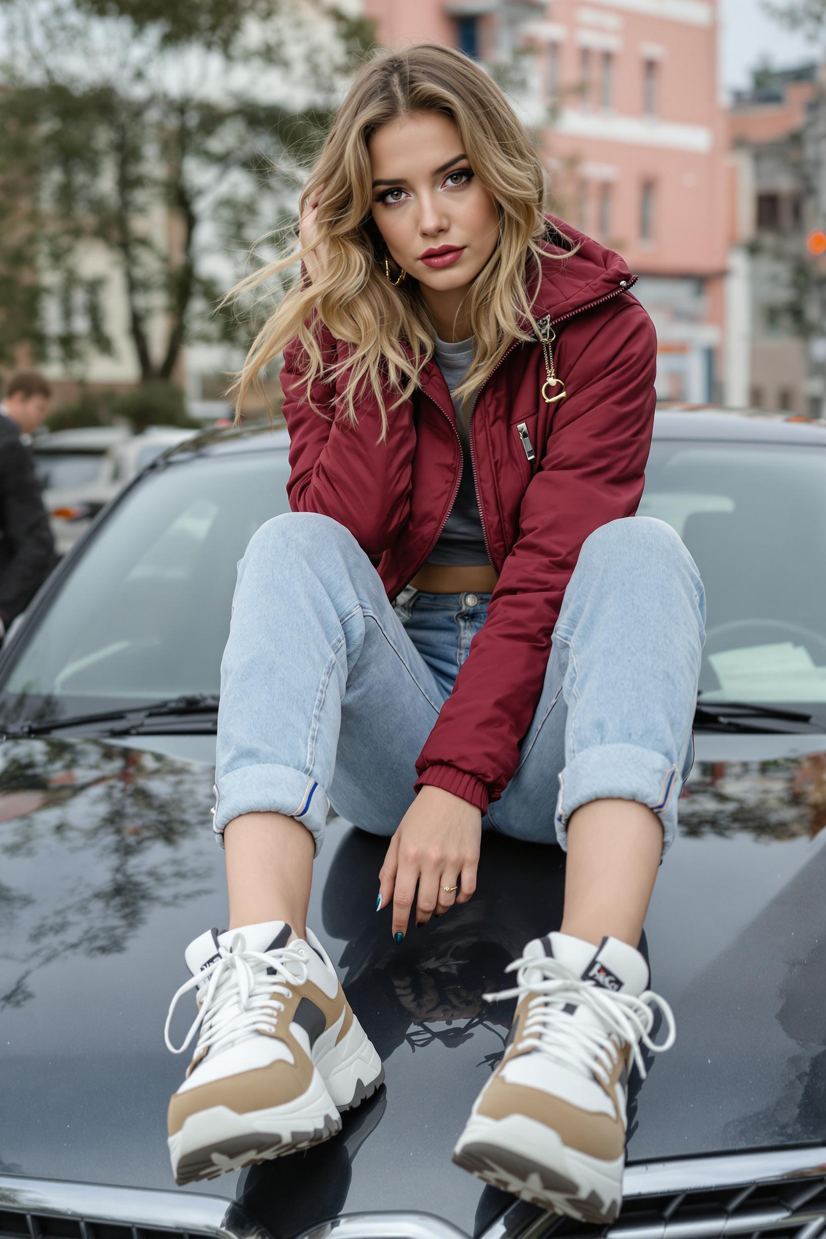 Женщина в тёмно-красной короткой куртке и массивных кроссовках сидит на капоте автомобиля, демонстрируя аксессуары, на лице уверенный взгляд. Крупный план, пафос и энергия.