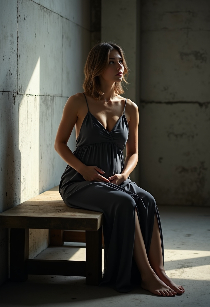 Женщина в тёмно-сером струящемся платье с разрезом сидит на низкой деревянной скамье у бетонной стены. Её одна рука держит живот, другая касается подбородка. Освещение точечное, с узким лучом света, создающим атмосферу уединения. Фон простой, индустриальный.