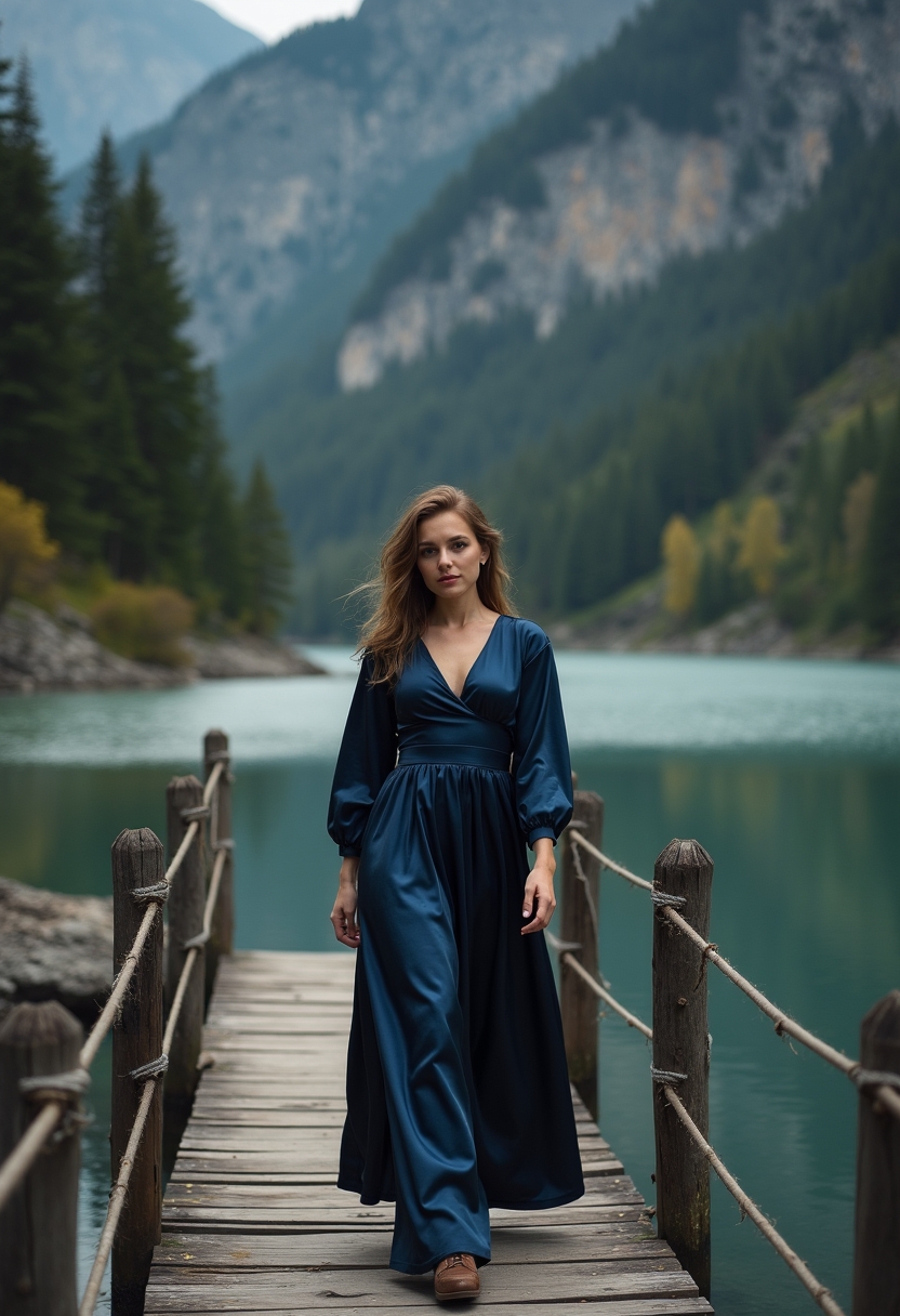 Примерить образ на себеЖенщина в тёмно-синем атласном платье с длинными рукавами идёт по деревянному мосту, перекинутому через горную реку. Её силуэт отражается в воде, а позади густой лес и скалистые утёсы. Она смотрит в камеру с мягкой улыбкой. Крупный план, подчёркивающий игру света и теней.