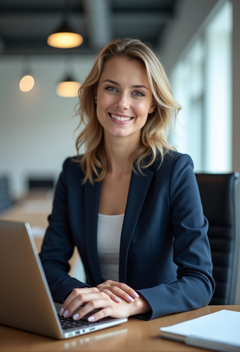Женщина в тёмно-синем деловом костюме сидит за офисным столом с ноутбуком, руки сложены на клавиатуре. Она смотрит в камеру уверенно, позади — большая светлая переговорная. Крупный план, атмосфера деловой сосредоточенности.