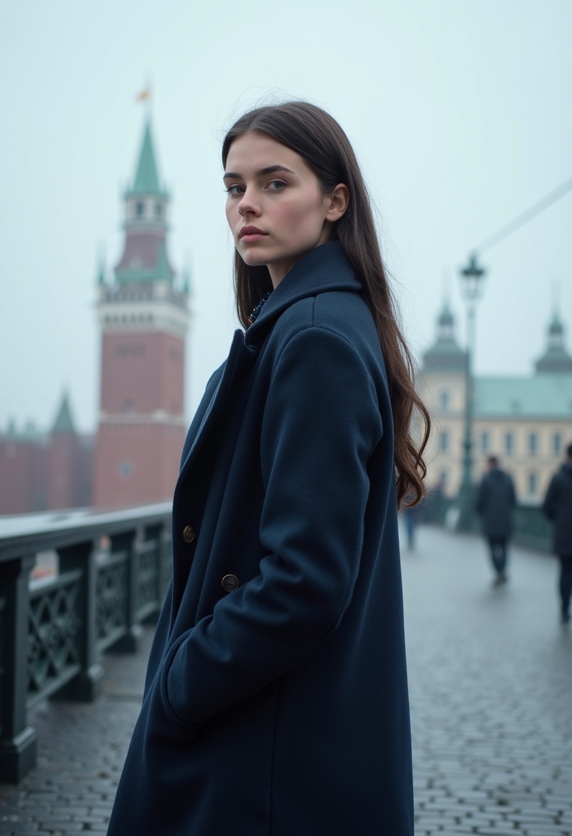 Женщина в тёмно-синем пальто стоит на Дворцовом мосту, её руки спрятаны в карманы, а взгляд направлен в сторону. Позади туман, скрывающий шпиль Адмиралтейства. Крупный план, акцент на меланхолии и северной красоте города.