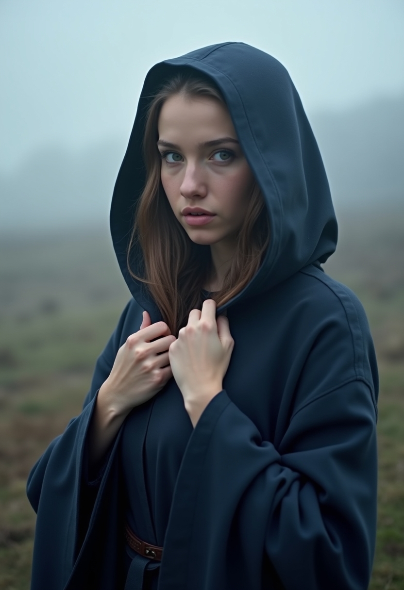 Женщина в тёмно-синем плаще с капюшоном стоит на фоне затуманенного пейзажа. Её лицо крупным планом, взгляд направлен вдаль, руки слегка касаются капюшона. Освещение естественное, акцент на её силуэте.