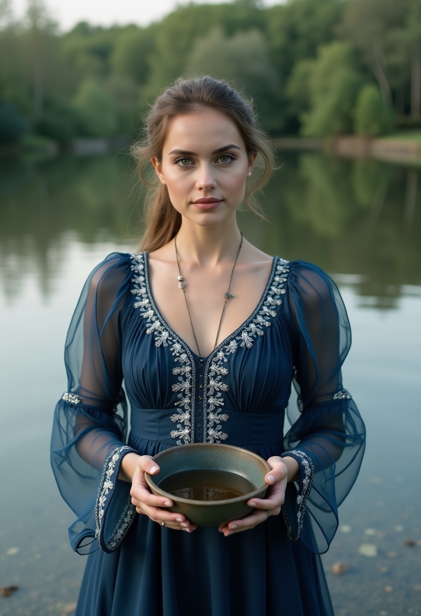 Женщина в тёмно-синем платье с серебряной вышивкой стоит у зеркальной реки, держит чашу с водой, смотрит прямо в камеру