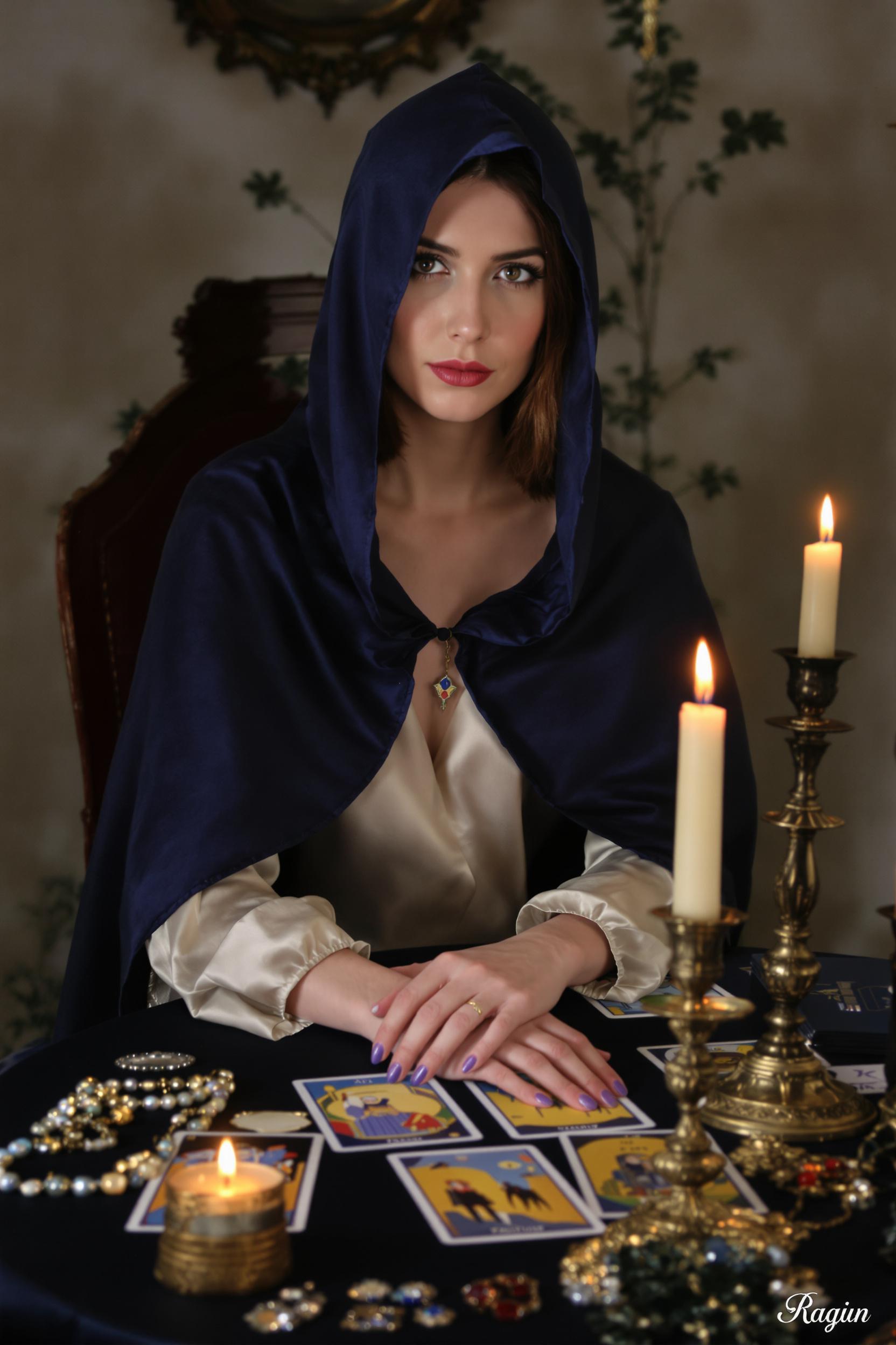 Женщина в темно-синей накидке с капюшоном поверх легкой шелковой блузы сидит за круглым столом, на котором разложены яркие карты Таро, рядом подсвечник с горящей свечой и амулеты. Она смотрит прямо в камеру, мистическая атмосфера.