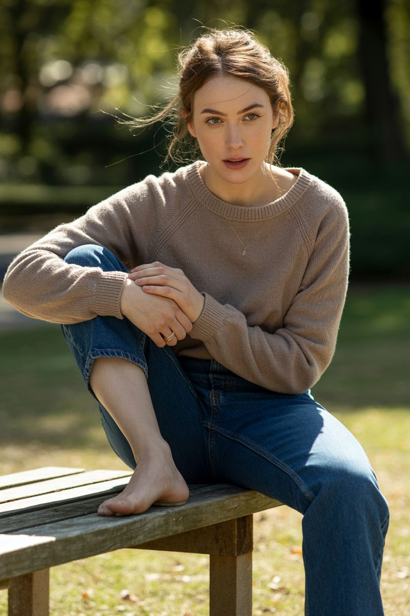 Женщина в темно-синих укороченных джинсах прямого кроя и светло-коричневом трикотажном свитшоте с рукавом реглан. На ней белые минималистичные кеды. Она стоит в парке у деревянной скамьи, одну ногу поставила на скамью, обе руки оперла на поднятое колено, смотрит прямо в камеру. Крупный план, яркий дневной свет, уютная уличная атмосфера.