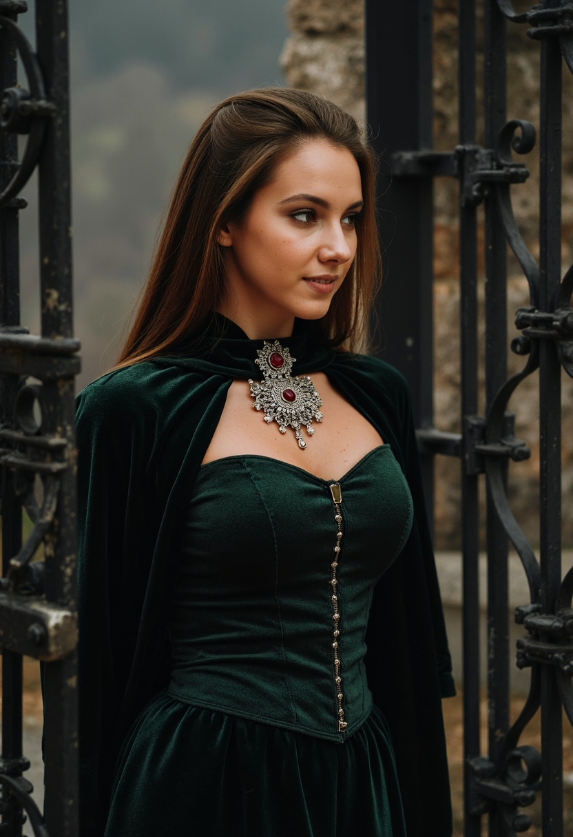 Женщина в тёмно-зелёном платье с корсетом и длинным плащом из бархата стоит у ворот замка с кованым орнаментом. На её шее массивное ожерелье из серебра с рубинами. Её взгляд направлен в сторону, а позади виден мрачный лес. Освещение естественное, акцент на драматическом силуэте и деталях наряда.
