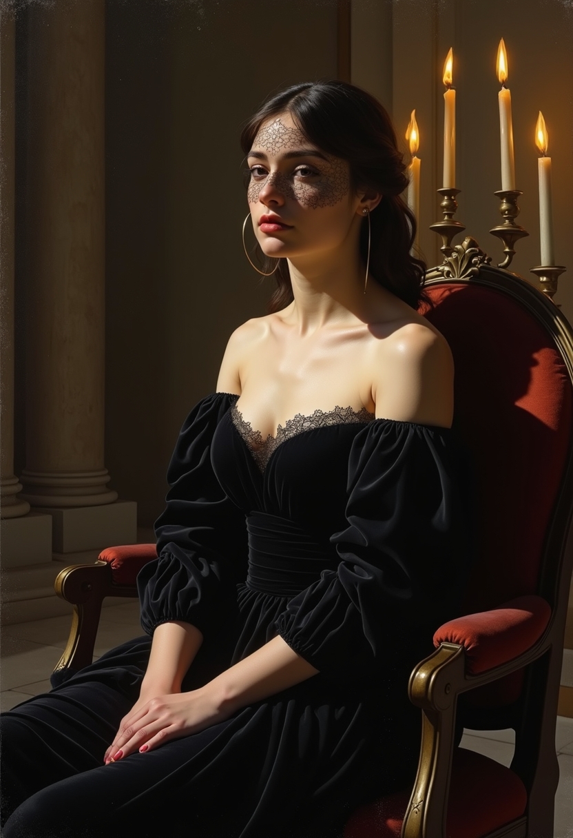 Примерить образ на себеЖенщина в тёмном бархатном платье с открытыми плечами сидит в кресле, её лицо слегка прикрыто кружевной вуалью. Свет от свечей отражается на её коже, создавая эффект старинного портрета в стиле Караваджо. Позади затемнённый интерьер с колоннами. Крупный план, подчёркивающий игру света и тени.