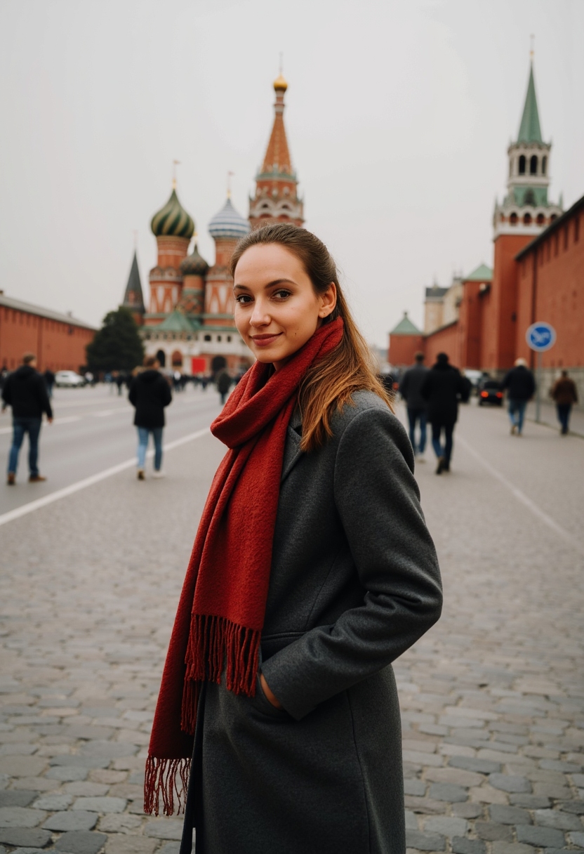 Женщина в тёплом пальто и русском платке стоит на фоне старинной мостовой Красной площади, смотрит прямо в камеру