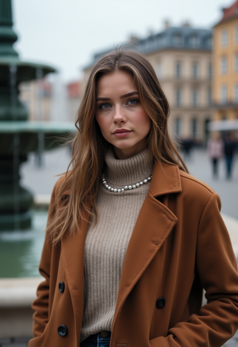 Примерить образ на себеЖенщина в тёплом пальто стоит на фоне площади с фонтаном, смотрит прямо в камеру, вокруг городской пейзаж