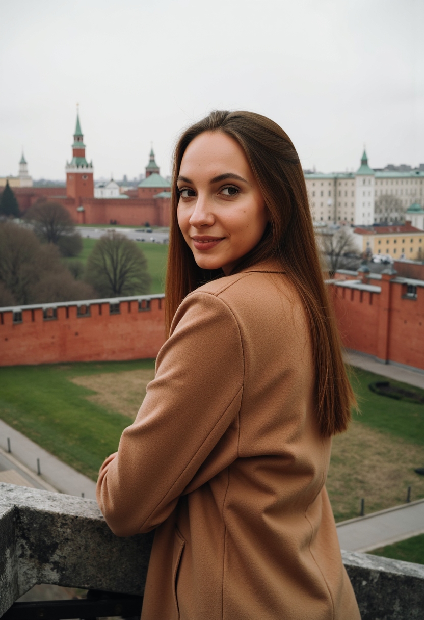 Женщина в тёплом пальто стоит на фоне старинных укреплений кремля, позади видны зелёные склоны и городская панорама, смотрит прямо в камеру
