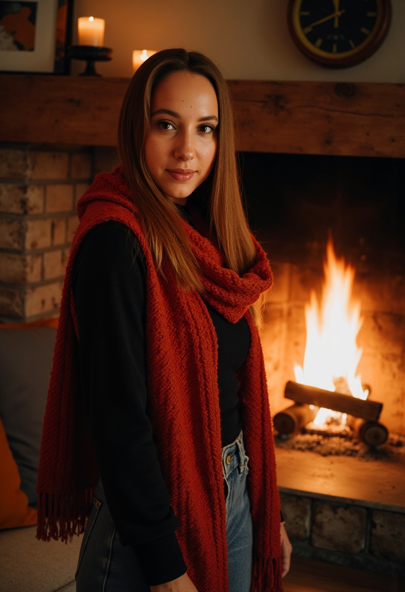 Женщина в тёплом шарфе Гриффиндора стоит перед камином с горящим огнём, смотрит прямо в камеру, вокруг уютная обстановка