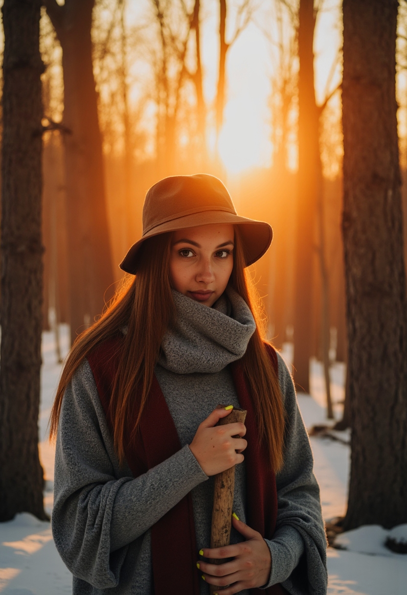 Женщина в тёплой накидке и платке стоит на фоне закатного зимнего леса, держит посох с резьбой, смотрит прямо в камеру