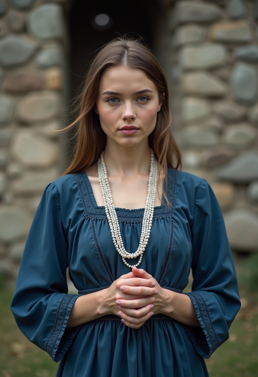 Женщина в традиционном платье глубокого сапфирового оттенка держит в руках длинные бусины из белого камня. Её руки сложены в мягком жесте, а позади виден старинный каменный дом. Ближний план, акцент на текстуре камня и плавности линий.