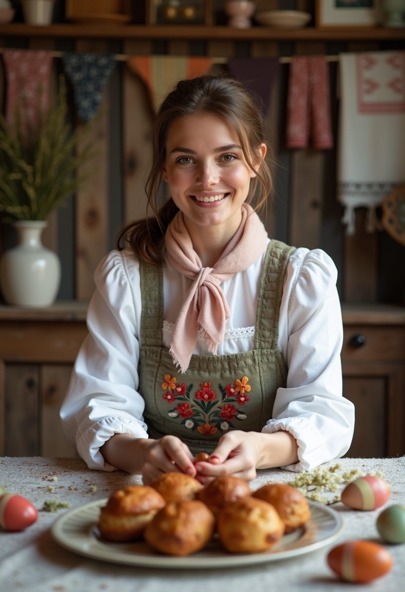 Примерить образ на себеЖенщина в традиционном русском наряде с вышитым передником и светлым платком сидит за праздничным столом, перед ней пасхальный кулич и расписанные яйца. Она смотрит в камеру с радостной улыбкой, её руки аккуратно держат яйцо, готовясь к традиционному «христосованию». Позади уютная деревенская изба,...