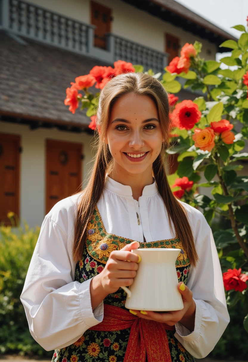 Женщина в традиционном русском сарафане с ярким цветочным узором и кокошником стоит на фоне старинной русской избы, окружённой цветущими кустами. В руках она держит кувшин с водой и улыбается, взгляд направлен прямо в камеру. Освещение яркое и солнечное, акцент на её лице и наряде.