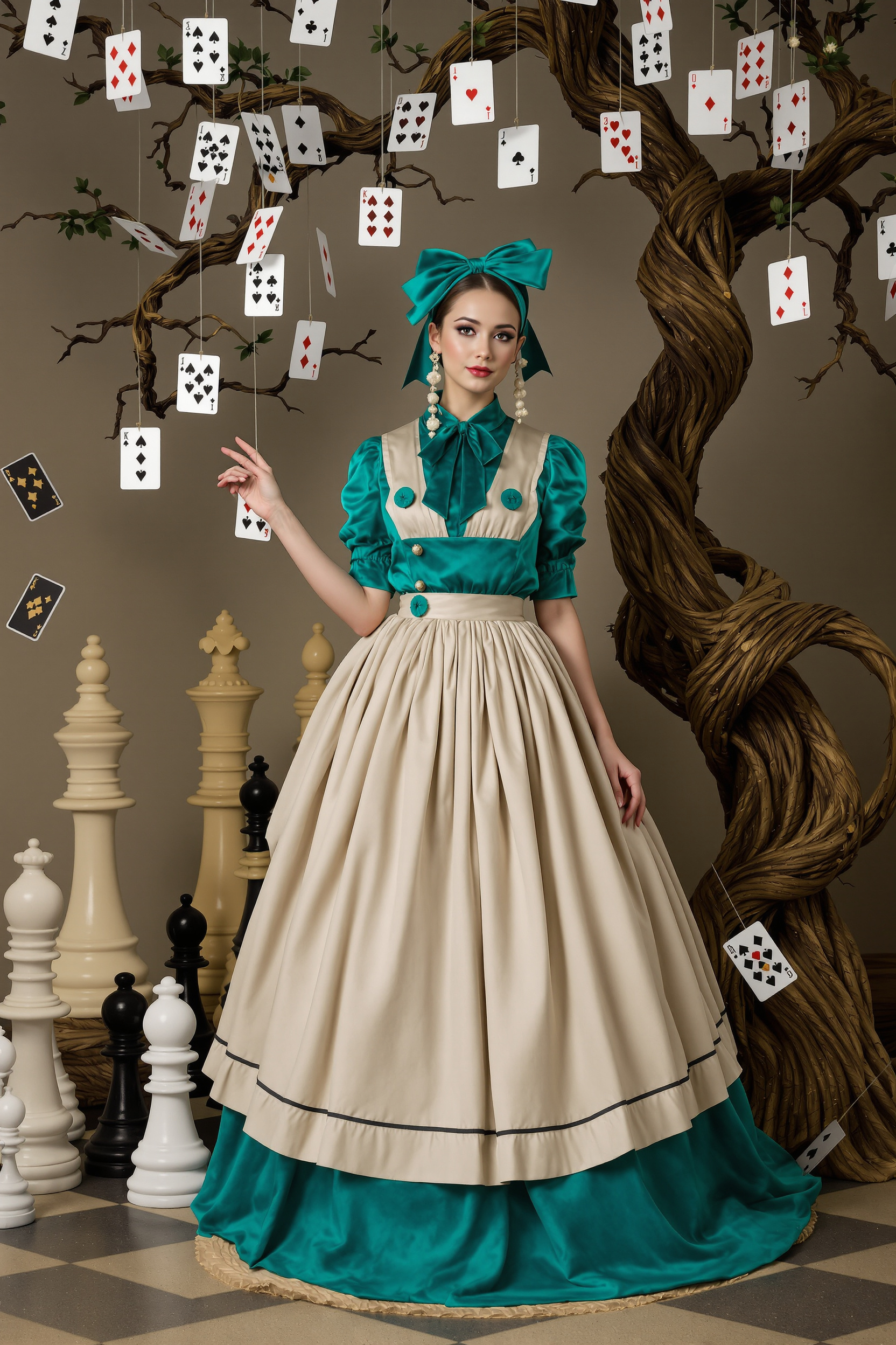 Женщина в удлиненном бирюзовом платье с пышной юбкой и бежевым фартуком, на голове бархатная лента-бант, за спиной массивные шахматные фигуры и извилистое дерево, руки касаются висящих игральных карт, смотрит в камеру, загадочный свет, средний план