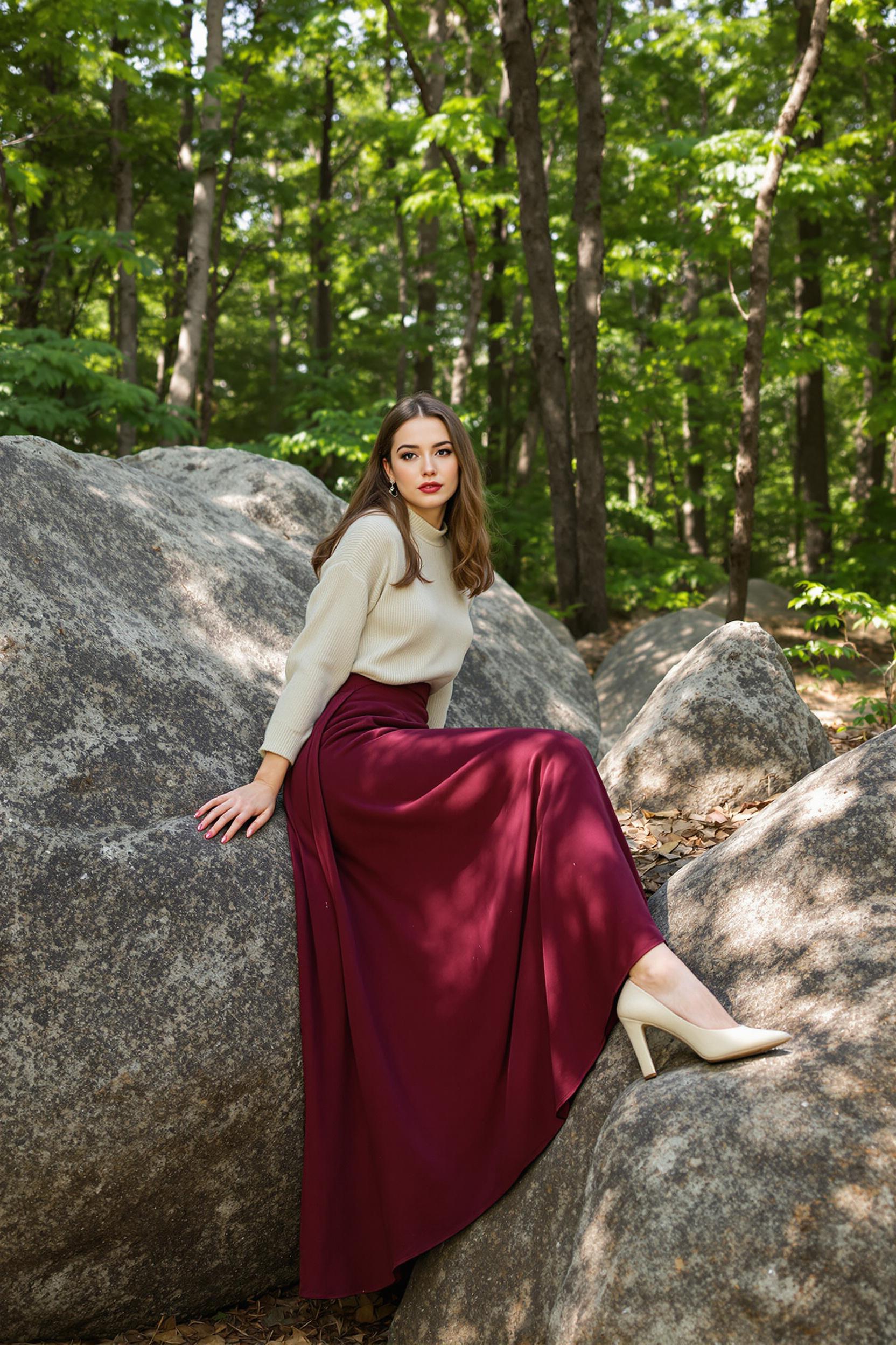 Женщина в удлинённой бордовой юбке и молочном свитере полусидит на большом валуне в лесу, опираясь рукой на камень, ноги скрещены, плечи слегка повёрнуты, она смотрит в камеру, свежий воздух, мягкое солнечное освещение, ощущение гармонии с природой.