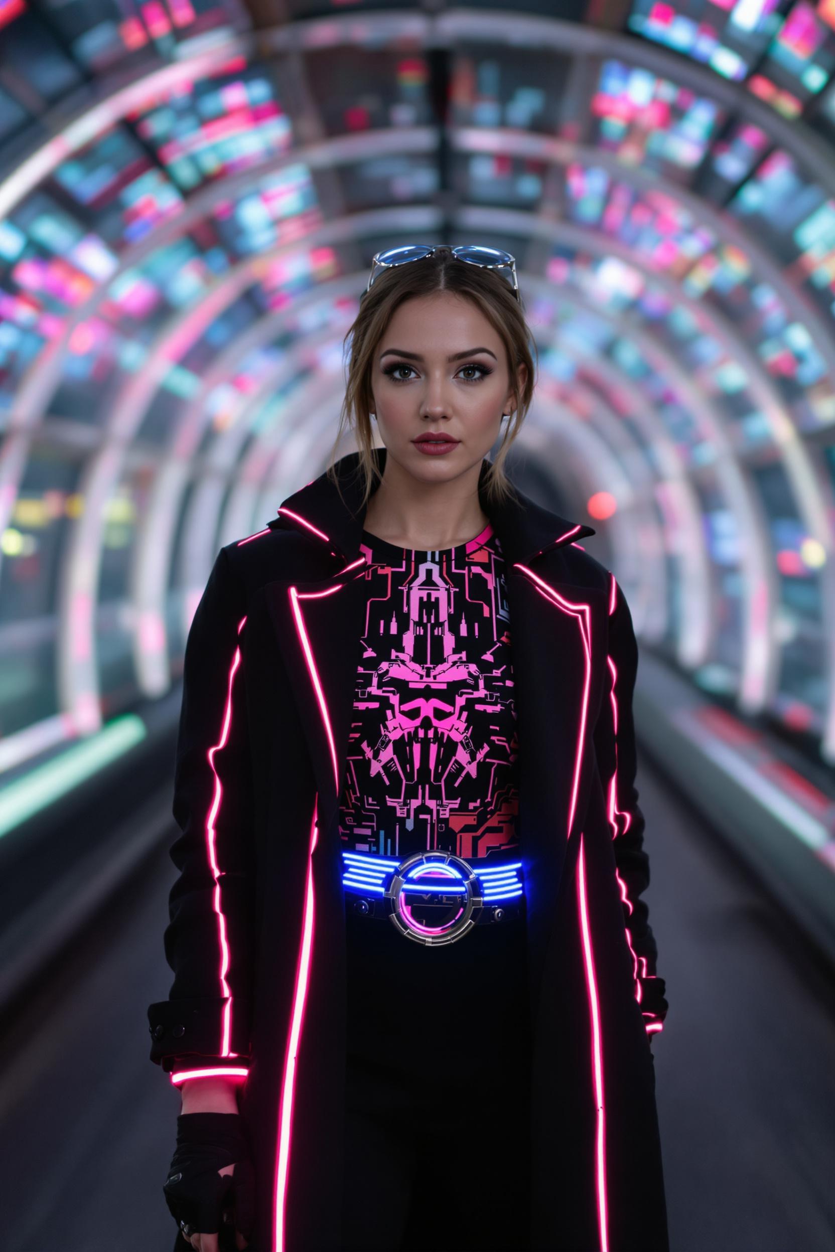 Женщина в удлинённой чёрной куртке с неоновыми красными лампасами, под ней топ с цифровым принтом, на талии светящийся пояс из металла, перчатки без пальцев, фон иллюминированные стеклянные мосты, средний план, прямой взгляд в камеру, стиль Blade Runner.