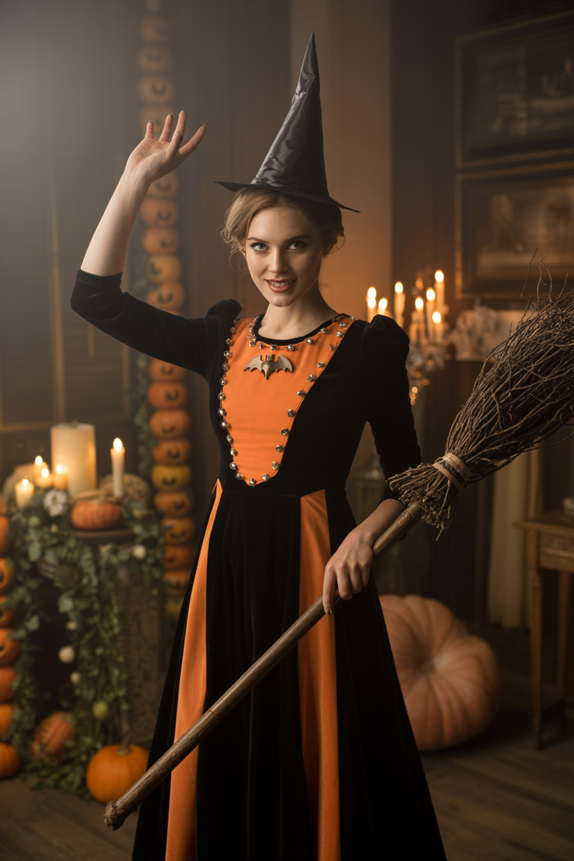 Женщина в украшенной паутинами гостиной, на ней длинное платье из чёрного бархата с ярко-оранжевыми вставками и серебристыми пуговицами, на груди брошь в виде летучей мыши, на голове высокая ведьминская шляпа, она держит в руках метлу и энергично взмахивает ею, смотрит в камеру с дерзкой улыбкой, вокруг пылают свечи и блестят гирлянды-тыквы.